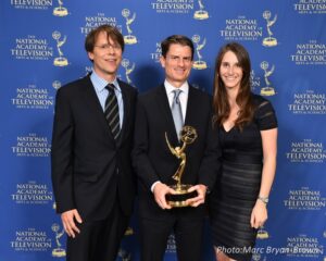 Coleman Cowan (center) enjoys Emmy night with co-producers Graham Messick and Eve Salomon.