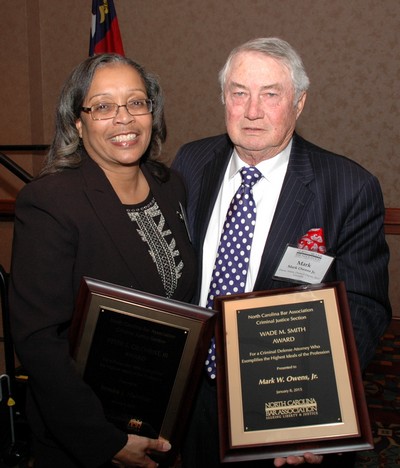 The North Carolina Bar Association Criminal Justice Section presented its annual Peter S. Gilchrist III & Wade M. Smith awards on Thursday, Jan. 8. The awards were presented at the Seventh Annual Peter S. Gilchrist III & Wade M. Smith Awards Dinner at the Embassy Suites hotel in Cary.